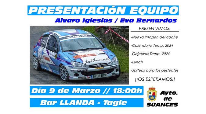 Álvaro Iglesias y su copiloto Eva Bernardos realizarán la presentación de su equipo en la jornada de hoy en el Bar Llanda en Tagle a partir de las 18:00 horas. Álvaro es uno de esos pilotos que nunca defraudan en las pruebas en las que participa con su Peugeot 206, ya que su rápido rodar siempre le colocan en puestos altos de la general.