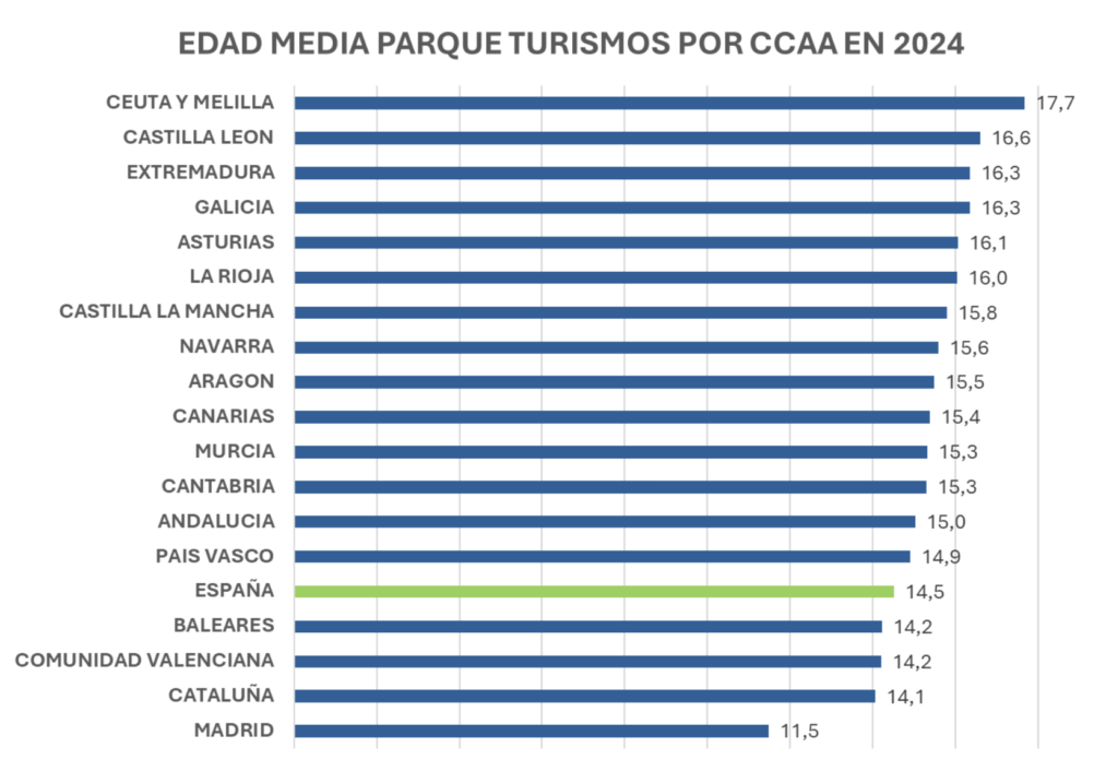 Por Comunidades Autónomas, hasta ocho regiones diferentes llegan a tener un parque donde 7 de cada 10 turismos circulantes superan los 10 años de antigüedad. Destacable es el caso de Ceuta y Melilla donde el 76,3% de los turismos supera esta edad media. Castilla y Léon, Extremadura, Galicia, Asturias,